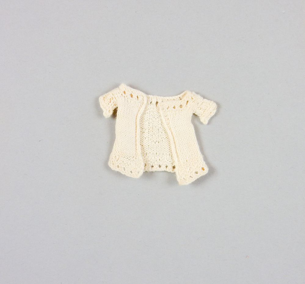 Vóór geopend jakje van katoen. Wijde ronde hals. Korte rechte mouwtjes in ander soort breisteek gebreid, afgezet met boordjes. Langs hals en onderrand gaatjes. De brede onderrand is verder gebreid in visgraatmotief. Dito baan in 't midden van het achterpand. De zijnaden zijn aangegeven door halve visgraatsteek.