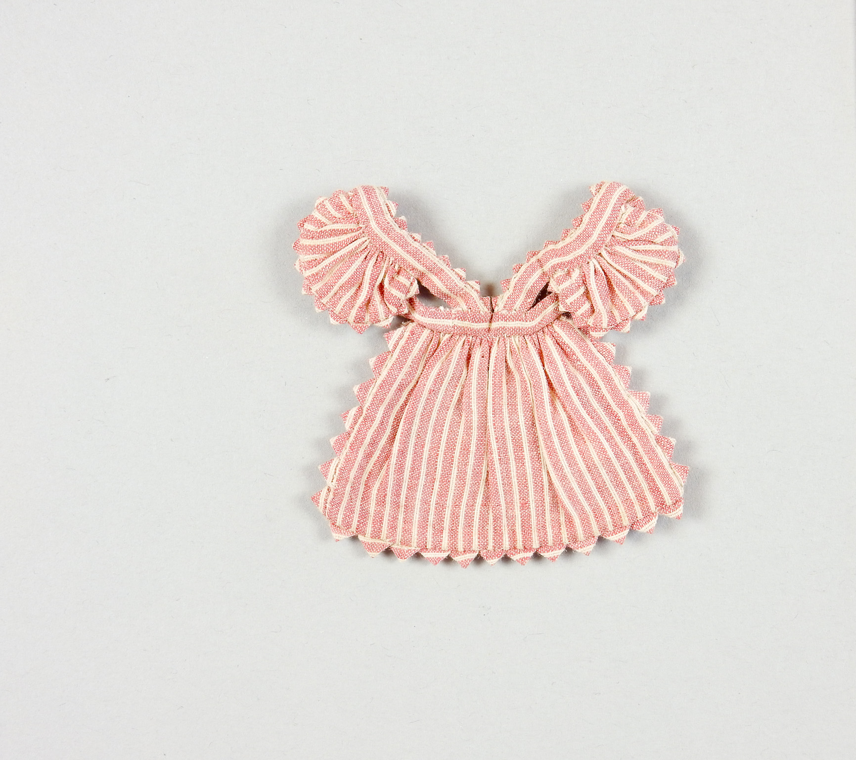 Driehoekig schortje van katoen met ingeweven streep. Schuine bretels, waartegen schouderflapjes (epauletten). Het schortje is ingerimpeld op een bandje aan het middel, dat achter gesloten wordt. De ronde schouderflapjes zijn ingerimpeld op de bretels. Het geheel is afgezet met picótje van hetzelfde materiaal. Als versiering en langs de binnenranden gevoerd met effen roze bandje.