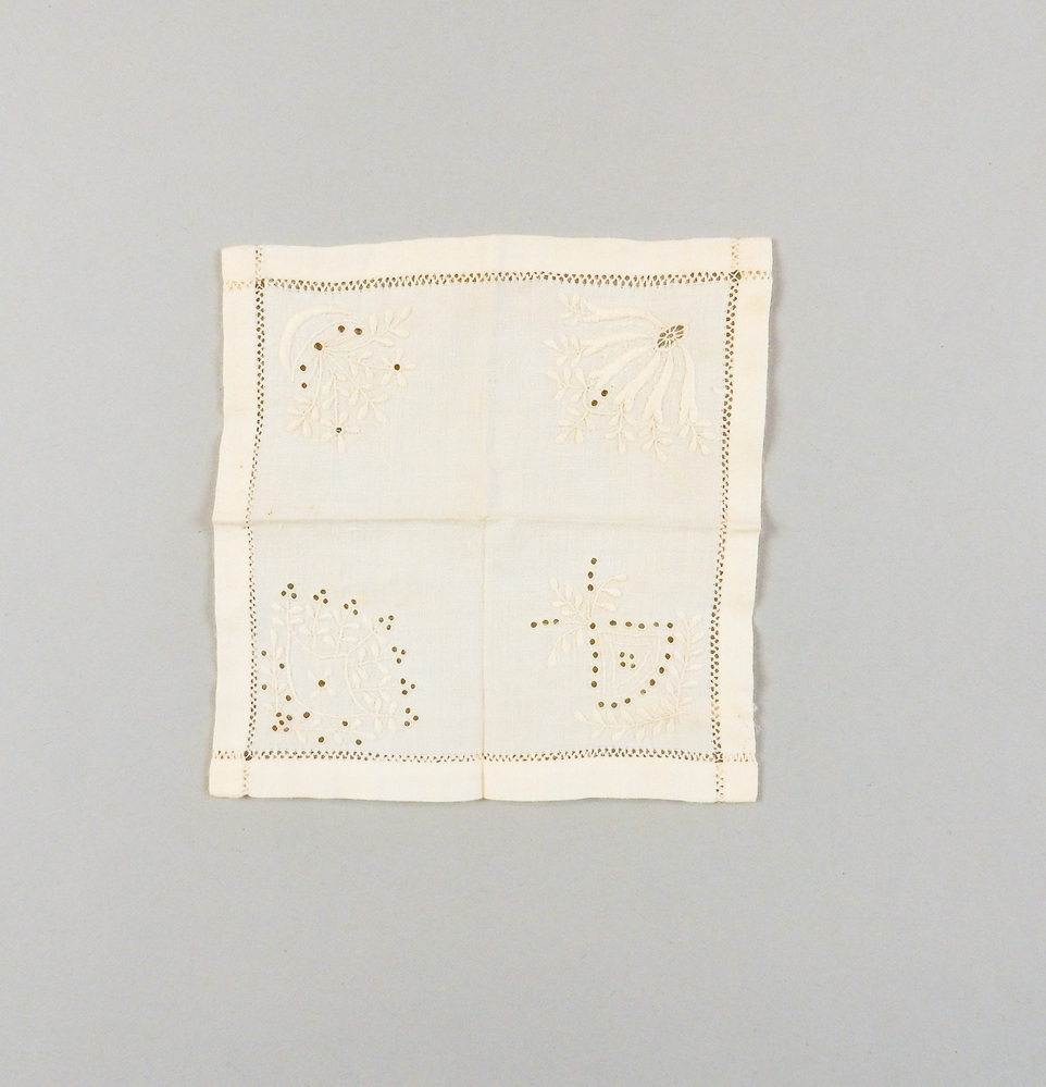 Lapje van katoen met ajourranden en in de hoeken vier verschillende geborduurde florale motieven.- Trefwoorden