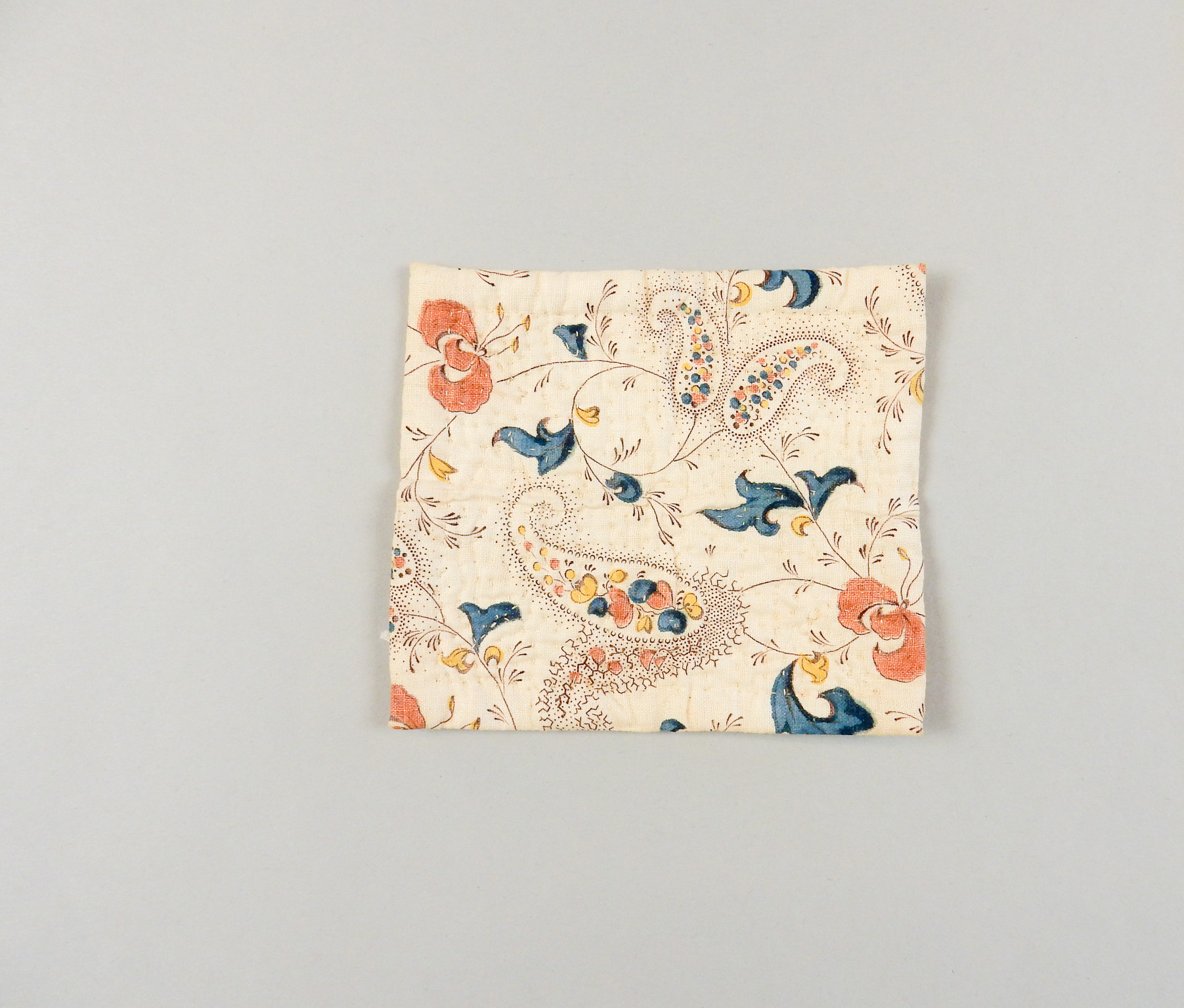 Doorgestikt dekentje van wit katoen bedrukt met floraal motief in blauw, geel, bruin en zwart. Gevoerd met wit linnen.