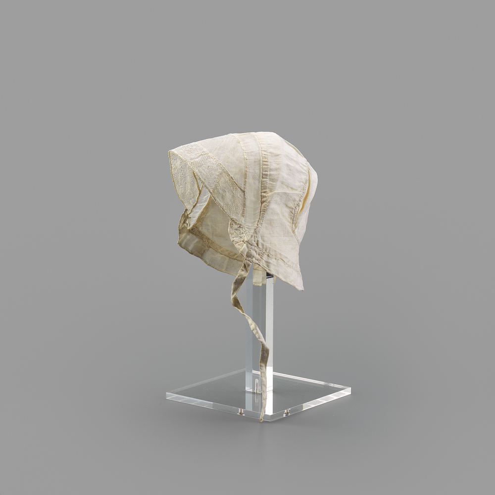 West-friese streekdracht babymuts of fontanelmuts van wit katoen of linnen batist. Aan de voorzijde versierd met een rand van kloskant. Bandje om te strikken.