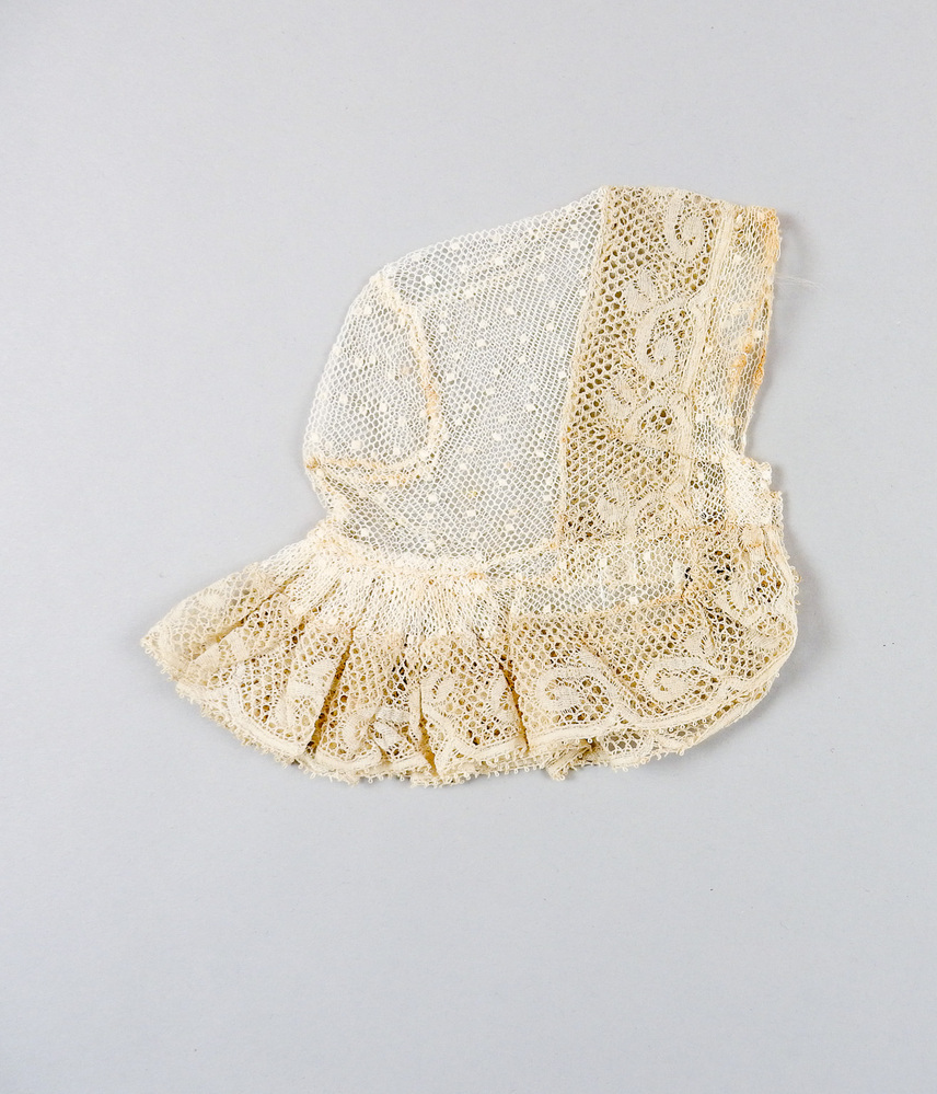 Bijzonderheden: Waarschijnlijk heeft de kant een fond van z.g. fond à cing trous (tralie op trolle kant). Vlaamse kant. Het mutstype behoort bij de West-Friese kap of oorijzermuts (volgens Duyvetter).