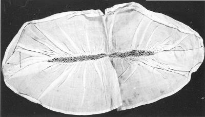 Wit katoen ovaal, ingerimpeld, met in het midden een geklost kant rand. 18de eeuws naaisel. Twee ingenaaide linnen banden, met een 18de eeuwse haak.