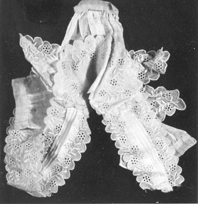 Cremekleurige canezou, handgeborduurd, met slippen (imitatie). Vastgespeld van voren. Waarschijnlijk voor een vrouwelijke pop bedoeld want sluiting klopt niet, terwijl bij miniatuur het stuk werd nagemaakt. Kort modieus, rond 1830. Effen batisten vóórgeopend lijfje met open zijnaden en geborduurde schouder-flapjes, z.g. epauletten (bestaande uit 2 delen). Eroverheen is een los geplooid kraagstuk aangebracht aan de voorkant, alleen achter bij de ronde hals vastgehecht. Dit kraagstuk loop aan de voorkant puntig toe naar het middel en is aan de achterkant verlengd met twee lapellen, die ongelijk van lengte zijn. Het batisten lijfje is achter hoog maar voor diep uitgesneden bij de hals. Het is ingerimpeld op boordje, achter puntig toelopend tot 't middel. De schouderflapjes, het kraagstuk en de daarbij behorende lapellen zijn geborduurd in Frans borduurwerk in florale motieven, met uitgeschulpte gefestonneerde rand afgezet.