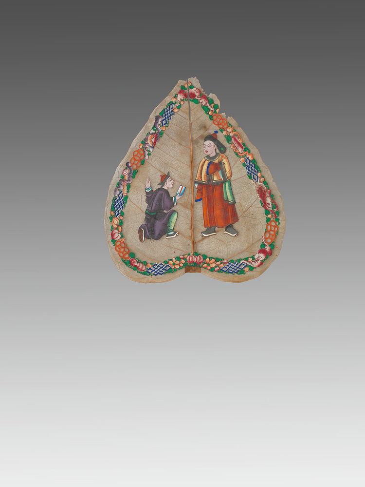 Schildering op gedroogd blad van de Chinese 'Bodhi tree'.- Trefwoorden