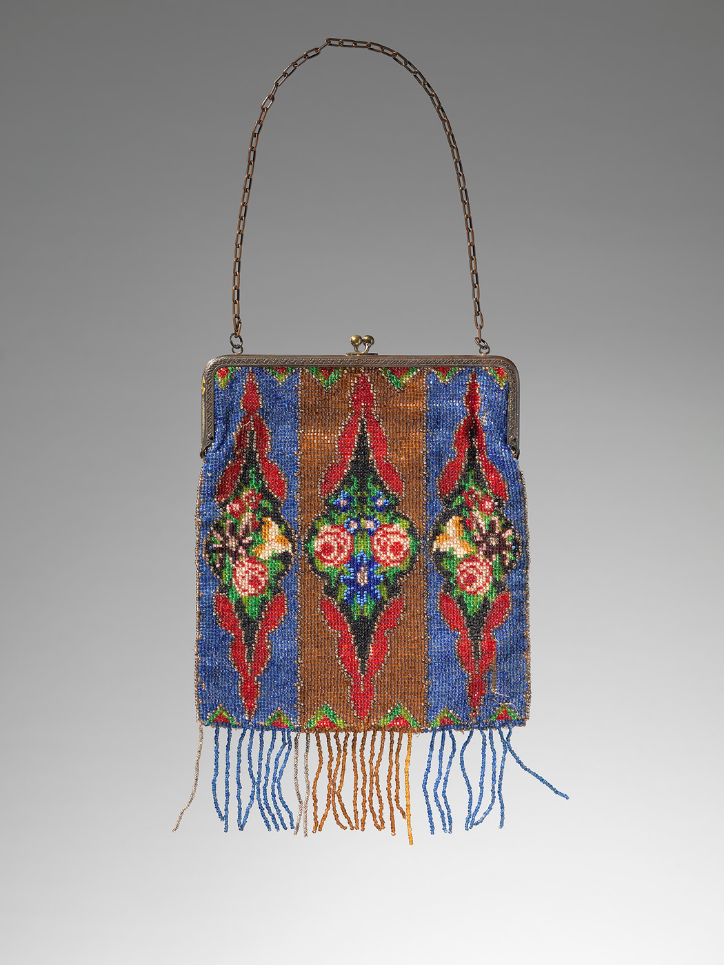 Kralenpatroon: aan beide kanten van de tas drie verticale banen met gelijkvormig patroon in verschillende kleuren, fond van de twee buitenste banen blauw, middelste lichtbruin, waarop een gestileerd, uitgerekt, puntig ruitpatroon, met binnenin een gestileerd bloemmotief van roosjes en knopjes in rood, roze, zwart, twee kleuren groen, licht- en donderblauw, metaalkleur. Waarven de twee buitenste asymmetrisch, de binnenste symmetrisch. Boven en onder zigzagrand in rood, groen en metaalkleur.