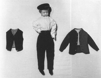 Pop met porseleinen hoofd en stoffen lichaam. Een losse pet, en twee losse sokken.- Trefwoorden