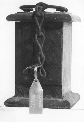 - Offerbus met ijzeren handgreep en ketting van drie schalmen, 1600 - 1799