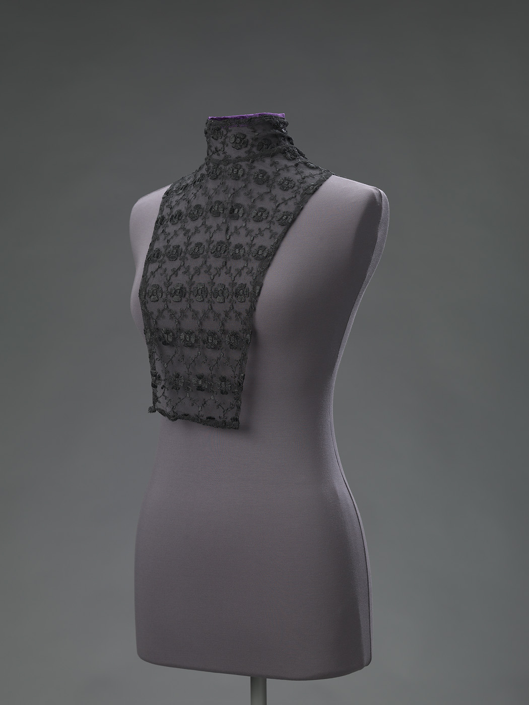 Guimpe van zwarte machinale geborduurde tule, sluiting boord middenachter met drukknopen, twee rugpanden die niet helemaal symmetrisch zijn. Paarse fluwelen rand langs de boord. Werd gedragen door een ouder persoon.- Trefwoorden
