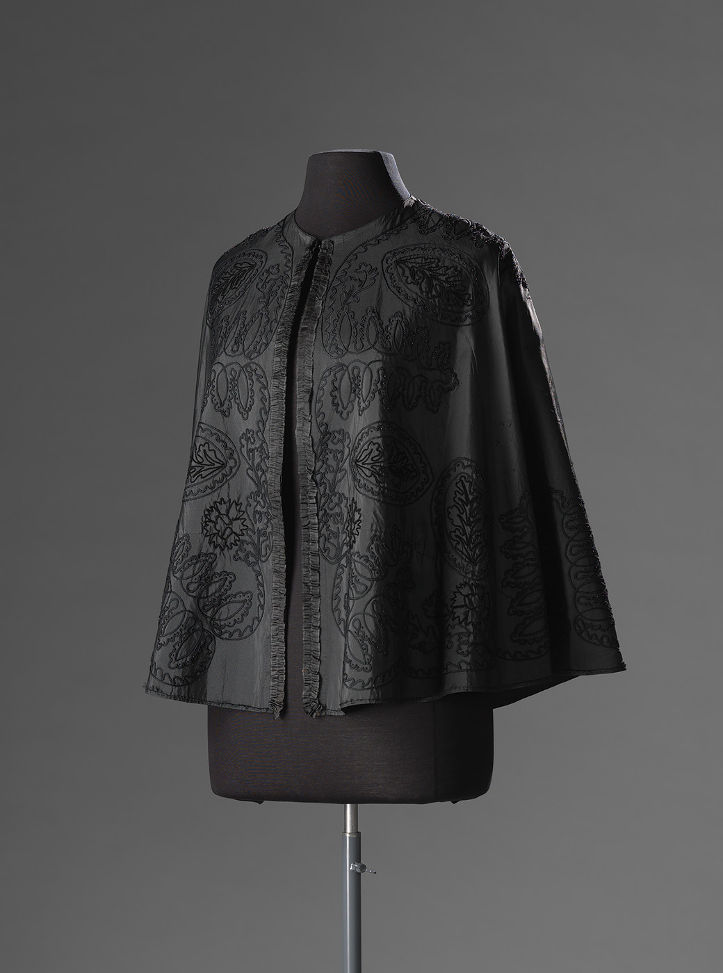 Zwarte, cirkelvormige pelerine (capemodel) van tafzijde. Bij de hals sluiting met haak en oog langs beide randen van de voorpanden, versierd met smalle zwarte ruches van zijde. Het ruche liep oorspronkelijk door langs de onderkantTwee ophanglussen aan de binnenkant op schouderhoogte. Rondom rand grote bladmotieven, afgewisseld met medaillons, van opgenaaide soutache en zwarte kraaltjes, in de medaillons een bladfiguur van chenillezijde.