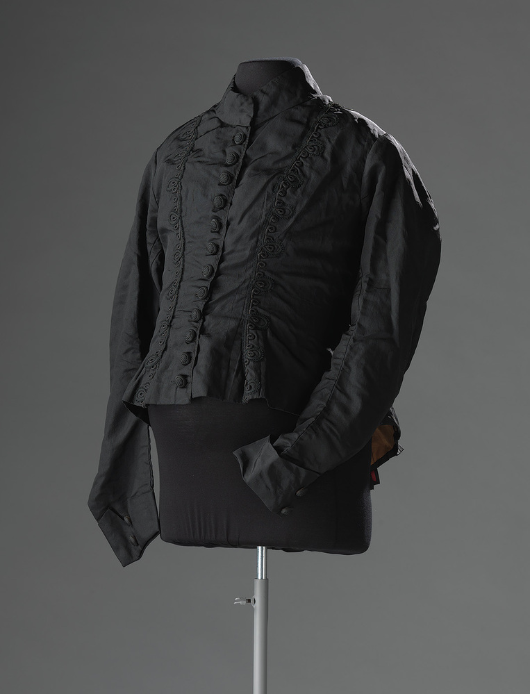 Zwart ribszijden japonlijfje (cerise zelfkant) met zwarte tresgarnering. Het lijfje heeft een hoge boord en knoopslsuiting middenvoor. Grauwe katoenen voering en baleinen.