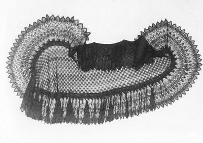 Zwarte langwerpige sjaal, zeer fijn machinaal gebreid, uitlopend in een punt. Middenveld met kleine ronde motieven en rondom een aangerimpelde geschulpte rand gebreid in zigzag motieven. Machinaal opgestikt galon op de aanzet van de strook, Waneer sjaal is omgeslagen is er een dubbele sierrand zichtbaar.- Trefwoorden