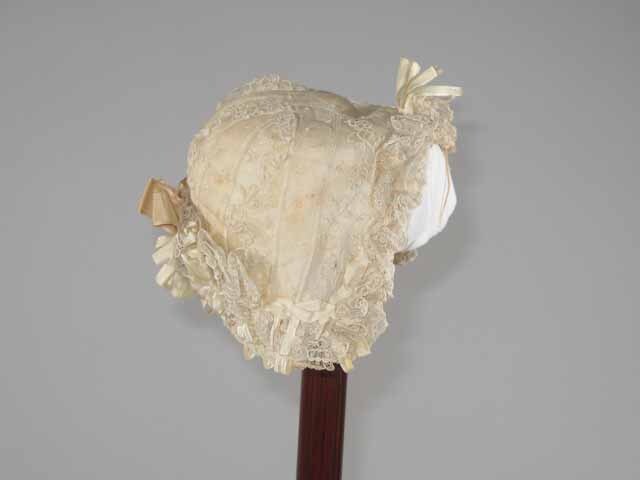 Crème doopmutsje, samengesteld uit zes baantjes alenconkant, afgewisseld met baantjes batist, geborduurd met moesjes. Rondom de muts twee strookjes ingerimpelde kant. Achter ingehaald en dichtgestrikt door twee koordjes. Versiering voorop van vier rozetten crème babylint, omgeven door ingerimpelde strook alenconkant met middenboven een strikje van ripslint, aan weerszijden een lintje, dat om het gezicht wordt dichtgestrikt. Zijden binnenvoerinkje. Ondermutsje, van crème batist, met hoefvormige bol, brede pas met vijf opnaaisels, waardoor koordjes gehaald zijn om het mutsje in te rimpelen. Rondom versierd met gekloste kantjes, vóór twee, achter één kantje. Aan weerszijden een batisten bandje, dat om het gezicht wordt vastgestrikt. Aan de achterkant een schuifje, waardoor koordje gehaald en dichtgestrikt.