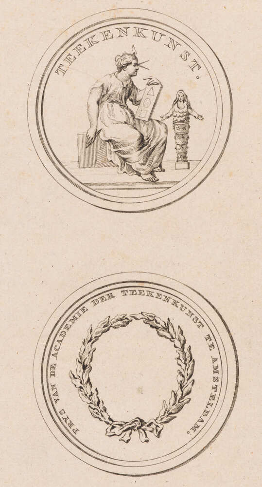 - Afbeelding van de voor- en achterkant van een prijspenning van de academie der tekenkunst te Amsterdam (naar Buys, J.), 1755 - 1795