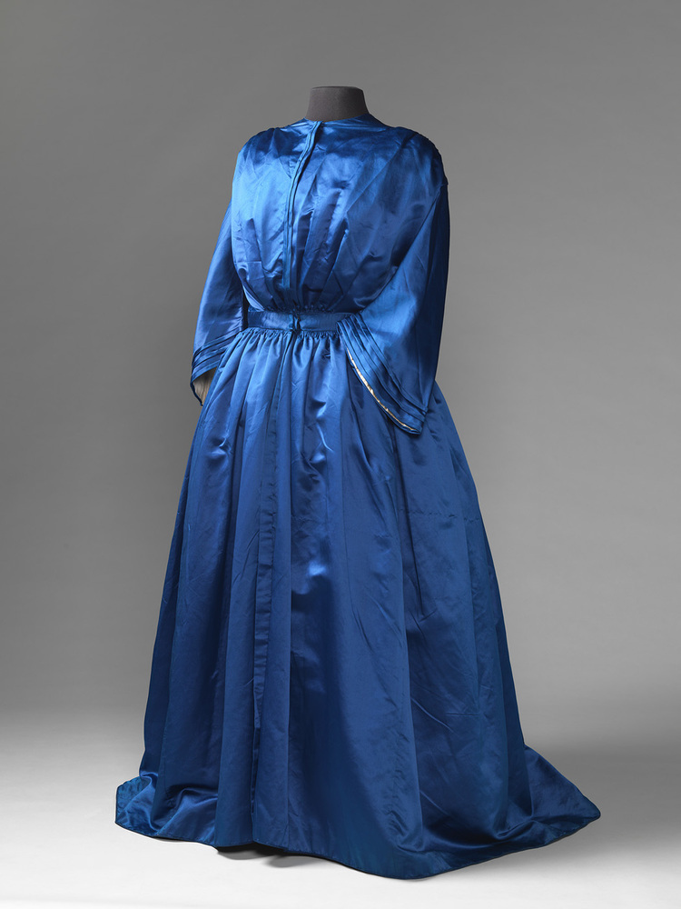 De japon past in de mode van 1860-1865 door de kleur blauw, de pagode mouwen en mouwinzet, de band bij de sluiting middenvoor en de sierknopen op de achterzijde van het lijfje. Niet alle onderdelen zijn even modieus. De rugplooien, de wijze van inrimpelen van het lijfje en ook de sierknopen op de achterzijde van het lijfje passen meer in de periode rond 1840-1850.