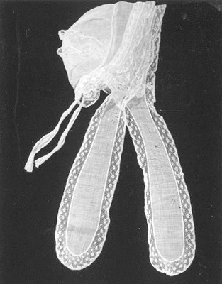 Witte muts met kleine bol met slippen die los horen te hangen. Kant langs bol en slippen. Band om muts aan te trekken langs binnenrand onderzijde. Huismuts voor een getrouwde vouw.- Trefwoorden