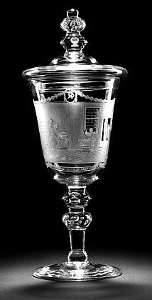 Helder kleurloos glas. Conische voet. Basisknoop. Balusterstam met dubbele rij luchtbellen, knoop en luchtbel. Conische, licht uitbuigende kelk met afgeronde basis. Op kelk een rechthoekig veld in neo-classicistische stijl waarin het interieur van een kuiperij met kuiper en twee gezellen. Hierboven guirlandes met medaillon waarin gekruiste kuipersgereedschappen. Onder voorstelling een tekstlint met het opschrift: ZO 'T NIET SLUIT, HET LEKT ER UIT./. Op andere zijde het gehelmde wapen van de familie Menssendijk, waaronder het opschrift: HET WELVAAREN VAN DE KUIPEREY./. Gewelfd deksel met samengestelde knop, luchtbel en dubbele rij luchtbellen. Rondom voet en deksel druivenranken en kuiperswerktuigen. Gesigneerd in raamkozijn: BVK/.