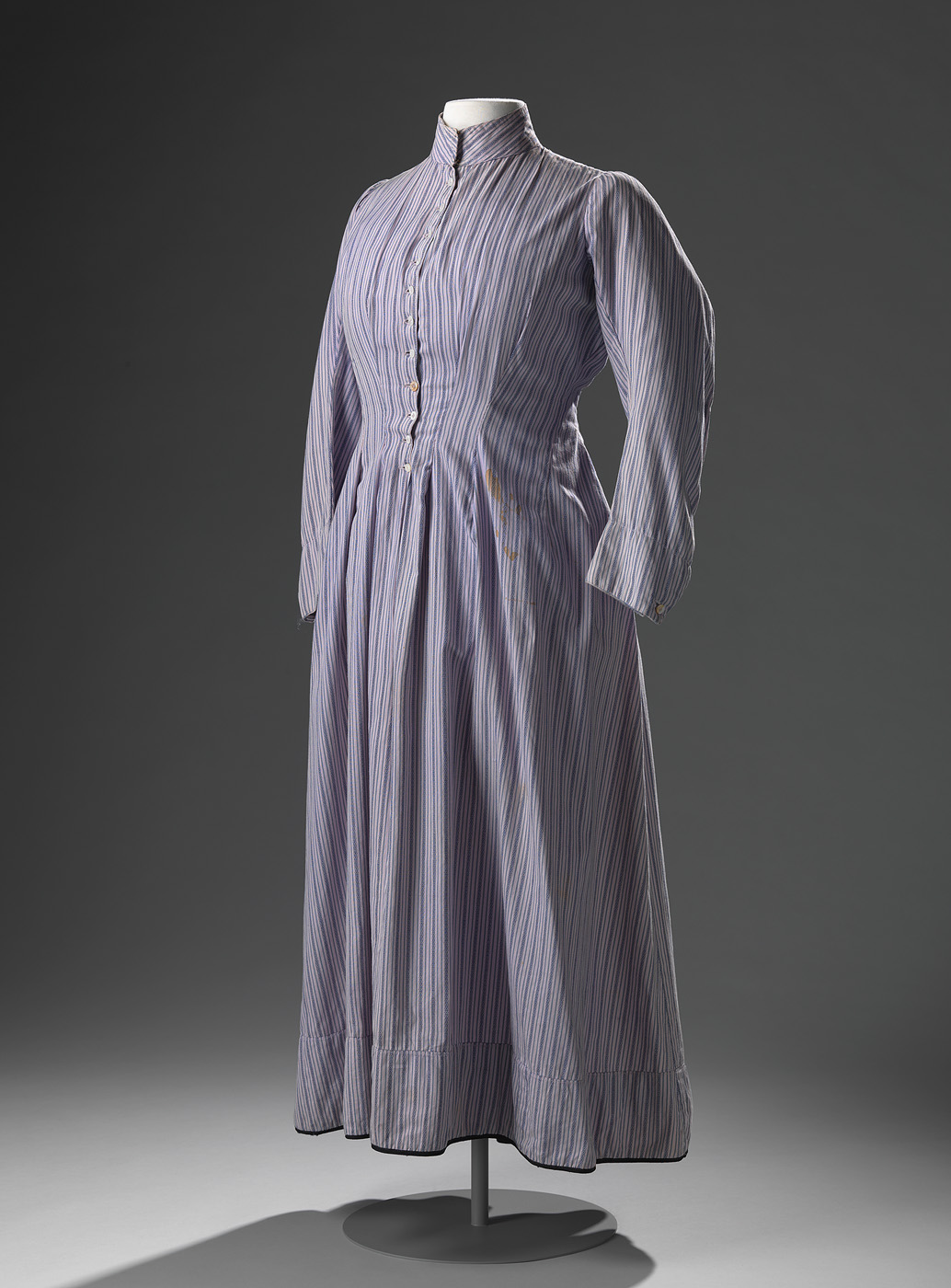Dienstbodejapon of volkse japon van lila katoen met grijze en blauwe gefigureerde strepen, enkellang. Hooggesloten model met opstaand boordje, geen taillenaad, gerend uitlopend, zogenaamd prinsessenmodel, lange mouwen. Sluiting middenvoor door middel van knoop en knoopsgaten. De rok loopt iets gerend uit, met zwarte stootband langs de zoom.