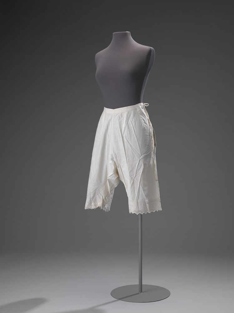 Dames onderbroek van wit katoen met korte pijpen. Zijsplitten in de taille, sluitend met striklinten. Het achterpand is gerimpeld aan de gladde tailleband gezet. De pijpen zijn onderaan versierd met drie horizontale oprijgsels en een strook broderie met geschulpte zoom.