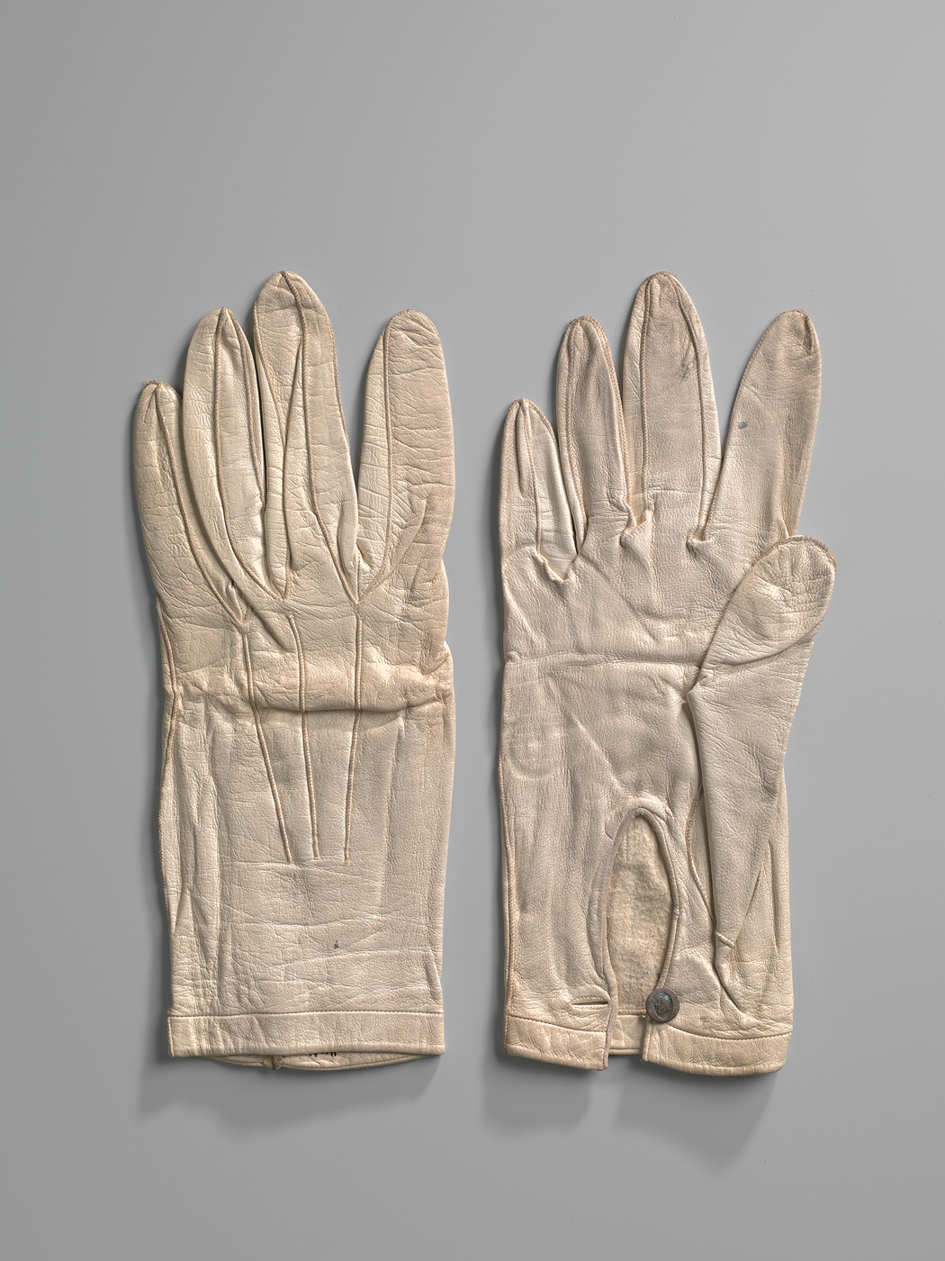 Een paar witte dameshandschoenen van glacéleer. Gesloten door één metalen knoopje. Bovenop drie stiksels in dezelfde kleur. De handschoenen komen uit het bezit van mevr. J. Markse uit Amsterdam.- Trefwoorden