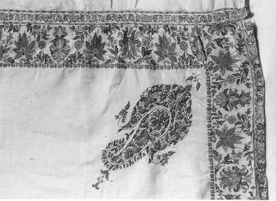 Crèmekleurige langwerpige sjaal van wol, met bredere en smalle aangezette rand met veelkleurig ingeweven bloemmotief. De contouren van de motieven zijn geborduurd. Langs de aanhechting van de brede strook en middenbaan een geborduurd randje van bladmotiefjes. In de vier hoeken van de middenbaan zijn vier zogenaamde 'britá's' geborduurd, kleuren rood, roze, oranje, geel, groen, paars, blauw en zwart.