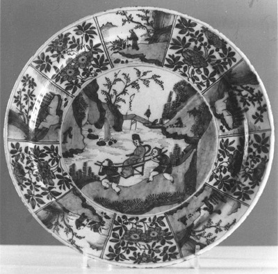 in het midden een rond medaillon met rotsachtig landschp met rivier- en brug, op de voorgrond een mandarijn in een draagstoel met twee dragers- Trefwoorden