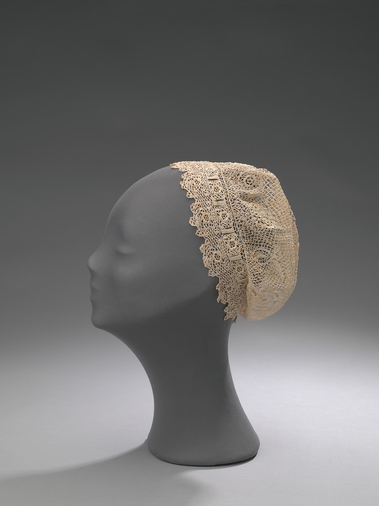 Witte gehaakte muts van katoen, Iers haakwerk (handgemaakt). Lint ontbreekt.- Trefwoorden