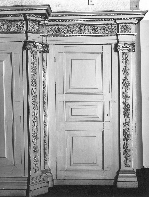 De betimmering van eikenhout bestaat uit drie vakken, waarvan twee vakken muurkasten zijn en een vak een deur vormt. Elk vak bestaat uit een geprofileerde voet, een lang vak, een ionisch architraaf, een fries met steekwerk en een kroonlijst met sofiet.- Trefwoorden