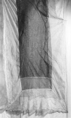 Langwerpige rechthoekige sjaal van blauwe tule met een brede rand van zeer fijne beige machinale kant.- Trefwoorden