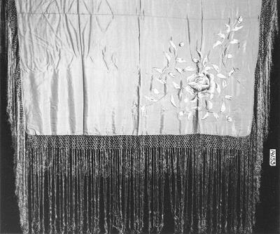 Vierkante grote groene zijden sjaal, met aan een hoek een grote rode gebroduurde roos met uitlopers. Gebruikelijk om de sjaal tot driehoek te vouwen zodat de roos zichtbaar was. Lange deels geknoopte groene frnaje van zijde.- Trefwoorden