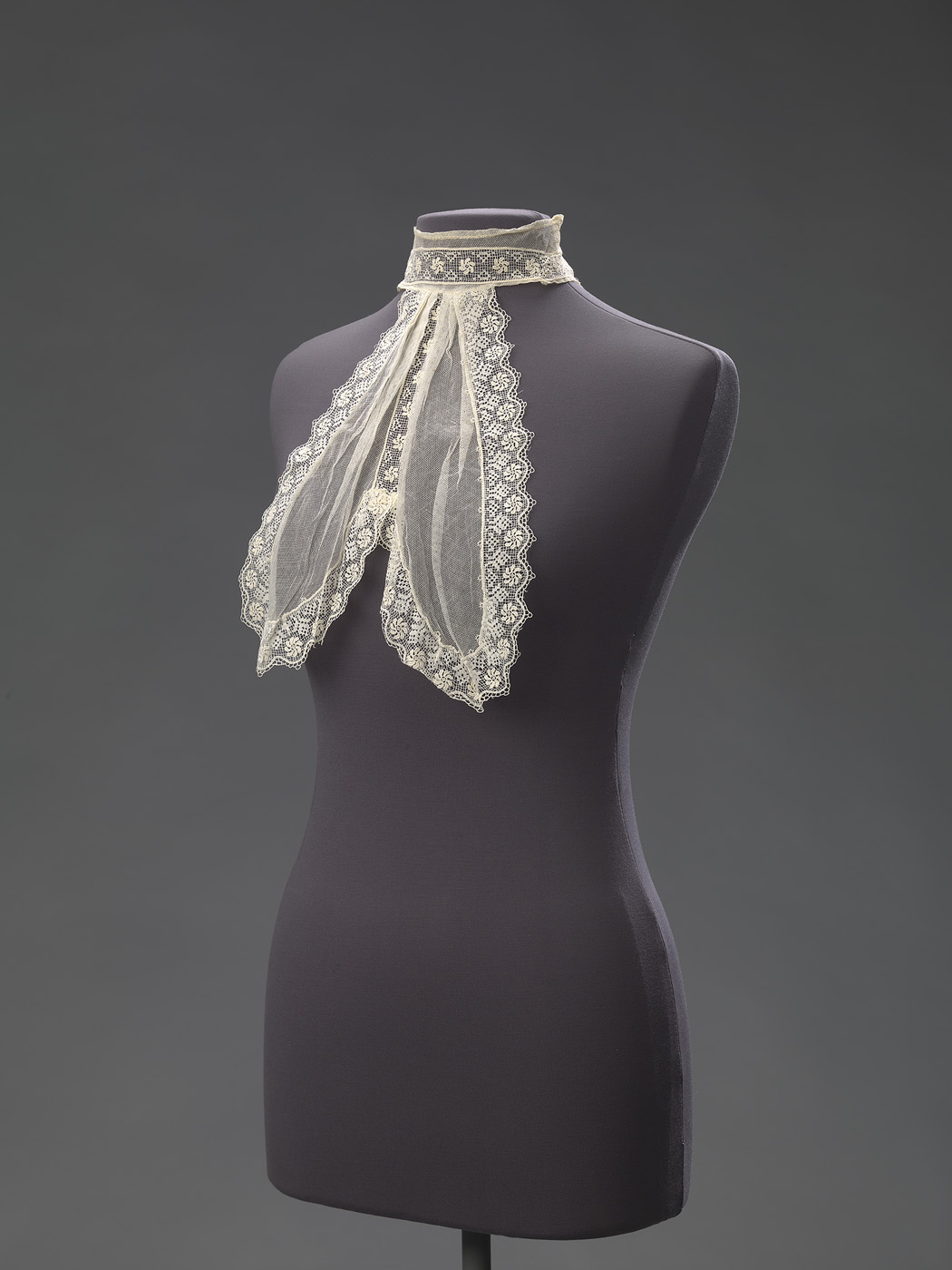 Witte guimpe met jabot van tule met randen van machinale filet. Sluiting middenachter. Filetkant was in de mode rond 1910.- Trefwoorden