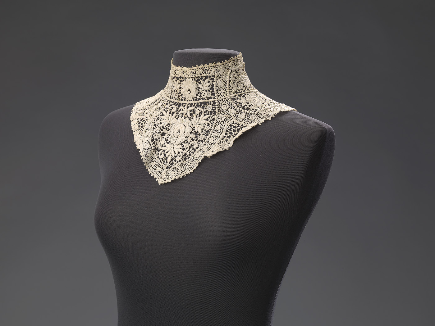 Witte guimpe kraag met hoge boord van etskant. Werd op de japon gedragen, en niet zoals een guimpe onder de japon.- Trefwoorden