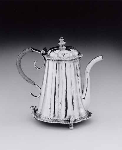 Gladde koffiekan met conisch zes-lobbig lichaam en scharnierend deksel. Drie voluutvormige poten, de bovenzijde in de vorm van een fabeldier. Platte onderrand met knerren- en slingerrand. S-vormige tuit en S-vormig oor, deels omwikkeld met pitriet. Bovenzijde rand lichaam met slingerrand. Gewelfd zes-lobbig deksel met knerrenrand en geprofileerde knop. Op deksel zijn een helmteken en ordelint gegraveerd van later datum, met het devies: STILL FOR MY FRIEND/.