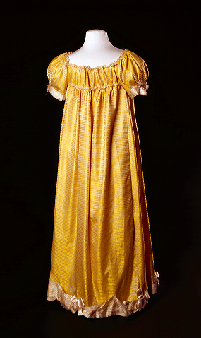 Zijden avondjapon, gele zijde met streepmotief. Sluik model, verhoogde taille, laag uitgesneden boothals, pofmouwen. (Empire-periode). De enkellange rok is langs de zoom afgewerkt met een gerimpeld zijden lint.