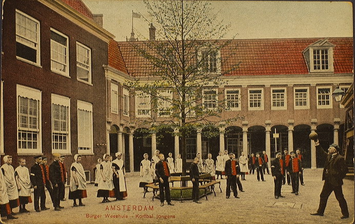 In het Amsterdamse Burgerweeshuis konden kinderen van Amsterdamse poorters (burgers met rechten om in de stad te wonen) terecht, die geen ouders of een moeilijke thuissituatie hadden. Het weeshuis was eeuwenlang een gesloten instelling, waar buitenstaanders niet zomaar naar binnen mochten. Voor de creatie van een fotoalbum, ter ere van het 25-jarige huwelijk van bouwkundige Pieter Heyn in 1904, werd een uitzondering gemaakt. Fotograaf August Stap maakte een unieke serie foto’s van het interieur, de wezen en het personeel van het Burgerweeshuis. Op de foto’s zijn de Burgerwezen tijdens hun dagelijkse bezigheden te zien. Zo komen onder meer de naailes voor meisjes, het ‘Slöjd’-onderwijs voor jongens en de zondagse gang op weg naar de kerk voorbij. Een groot aantal van de foto’s zijn later gebruikt voor de productie van een serie ansichtkaarten in kleur, waaronder deze ansichtkaart van een korfbalwedstrijd op de jongensbinnenplaats. ( Sarah Remmerts de Vries)