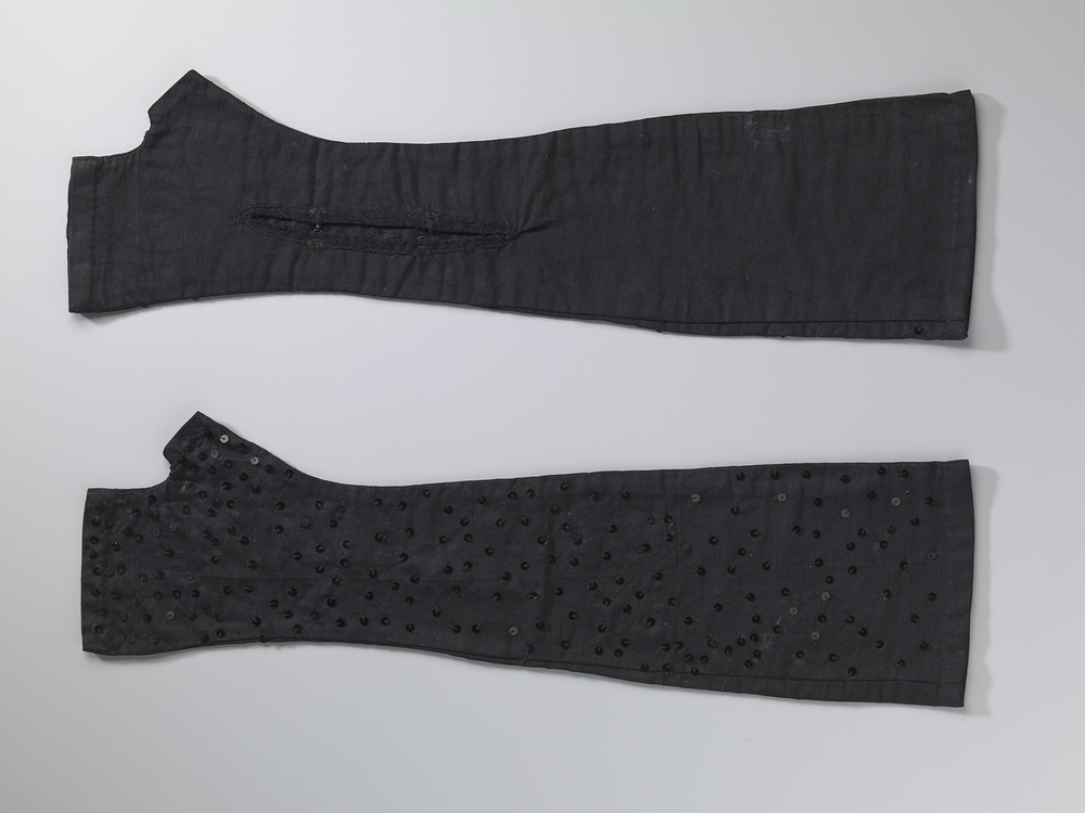 Paar zwarte mitaines met pailletten, aan de binnenzijde een split met haak en oog sluiting. Waarschijnlijk bedoeld voor toneel of om te verkleden.- Trefwoorden