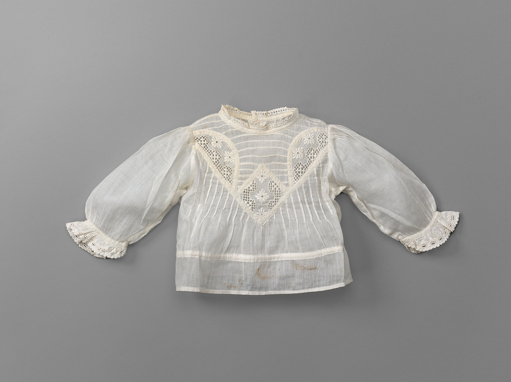 Babyblouse van dun wit katoen (batist). Ronde hals afgezet met sierband en broderie. Lange mouwen, ingerimpeld aangezet, bij de pols ingerimpeld aan hetzelfde sierband waaraan een ruche van broderie. Het voorpand bestaat uit een V-vormige bovenkant versierd met horizontale oprijgsels, sierband en broderie. Daaronder is het lijfje in verticale oprijgsels aangezet, glad doorlopend naar achteren. Achter open, sluitend met twee parelmoeren knoopjes. Naast de sluiting drie verticale oprijgsels. Inhaalband in de taille.