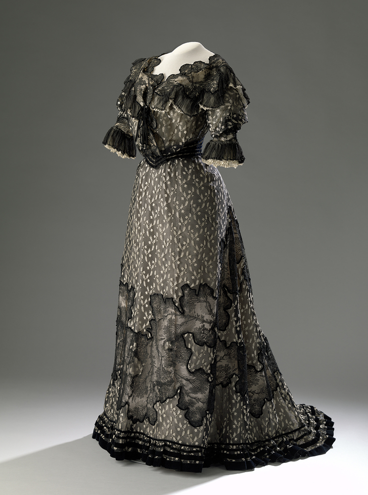 Twee-delige diner- of uitgaansjapon. 'Gaze de soi' met ingeweven bloemmotief, incrustaties van machinale kant, afgezet met een smal fluwelen bandje. Bestaande uit een lijfje, eindigend in een met baleinen verstevigde punt in de taille. Wijde hals, schouderkraag met een versiering van geplisseerde zwart zijden voile, en zwart kant. Mouwen eindigend boven de elleboog, afgezet met naturelkleurige en zwarte geplisseerde voile. Het lijfje van dunne naturelkleurige zijde en zwart machinaal kant is gezet op een verstevigde binnenvoering van katoen met baleinen waardoor de beoogde S-lijn, of het droit-devant silhouet, verkregen werd. De gerende rok loopt klokkend uit en eindigt in een sleepje middenachter.