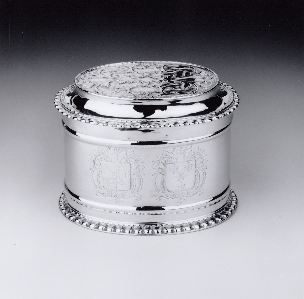 Ovale doos met scharnierend deksel. Kabel- en parelrand langs onderrand doos en deksel. Wand met twee profielranden, waartussen aan de voorzijde twee gegraveerde, niet-geïdentificeerde familiewapens, waarboven de initialen: D.G.H./ en: I.I.A./. Deksel met zich verjongend middendeel. Op deksel en op achterzijde wand een uitgezaagd en opgelegd symmetrisch rankenpatroon op een geruwde ondergrond.