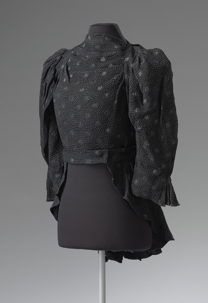Zwarte blouse met ingeweven glimmende nop, lange pofmouwen met schoudervullingen van rokband. Sluiting met drukknopen in de taille en op de schouders. Met ceintuur.