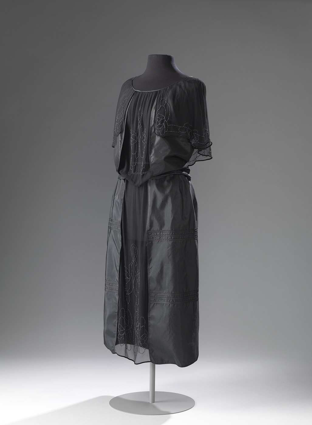 Tweedelige japon, bestaande uit blouse met rok van zwarte zijde met tule en kraaltjesgarnering.