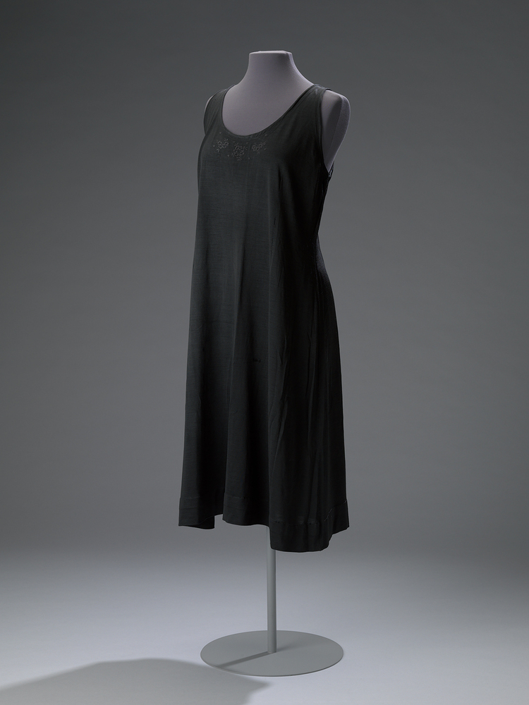 Zwarte charmeuze onderjurk, van filet de cos. Met geappliceerde bloemetjes op de voorkant.- Trefwoorden