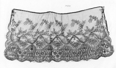 Zwarte korte en brede hoedenvoile van machinaal kant met slingerornament van gestileerde bloemen. Rijgveter langs bovenzijde.