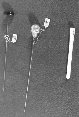 Met de aanschaf van een hoed werden meestal een of meerdere hoedenpennen gekocht. Hoedenpennen waren er in allerlei soorten en kleuren en zorgden ervoor dat een hoed goed en stevig op het hoofd bleef zitten. De lange puntige stalen pennen werden door de bol van de hoed in het er zich onder bevindende haar gestoken. Pennen zonder beschermdopjes waren scherp en konden voor verwondingen zorgen bij omstanders. Het gemeentebestuur van Amsterdam nam daarom in 1913 in een politieverordening op dat “het verboden is in het openbaar van hoedepennen gebruik te maken, waarvan de uitstekende punten niet zijn voorzien van doelmatige beschermers”. Zelfs in de trams waren destijds bordjes aangebracht waarop deze verordening werd vermeld. In de hoedenwinkel waren de pennen met beschermdopjes op een kussen gestoken dat zich meestal op de toonbank bevond zodat men de hele collectie goed kon overzien. ( Annemarie den Dekker)