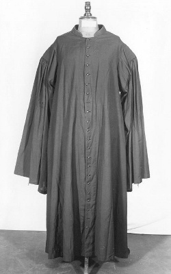 Zwarte toga van dunne wollen stof met grijsgroene zijden voering en 14 knopen. Geborduurd in beige kruissteek: GC- Trefwoorden