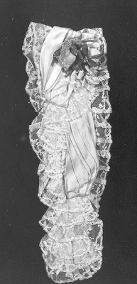 Jabot van machinale kant en beige zijde en bloemcorsage. Op te spelden met veiligheidsspeld, en vast te zetten in de taille. Waarschijnlijk heeft de jabot als voorkant bij een japon gehoord.- Trefwoorden