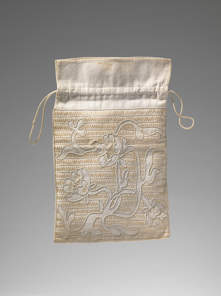Reticule van wit borduurlinnen, met zijden D.M.C.-garen. Geborduurd met gele en grijze bloemmotieven in art nouveaustijl. Ingehaald door wit koordje.- Trefwoorden