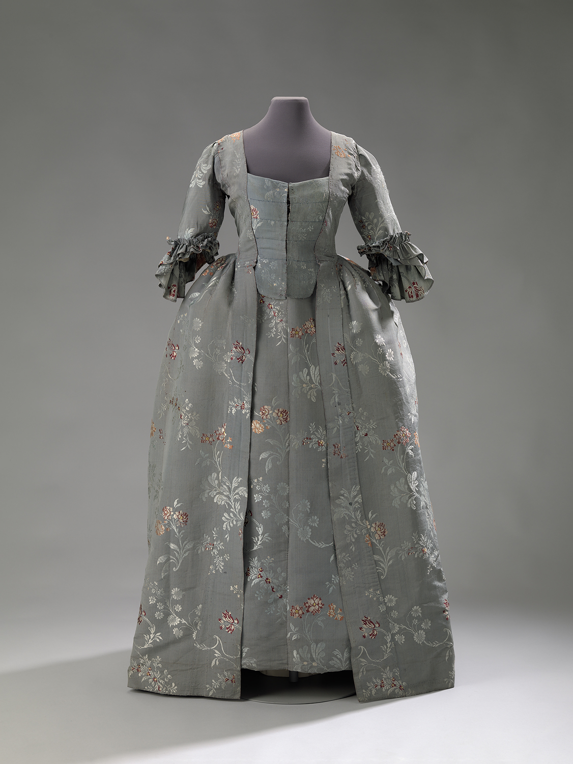 Twee-delige japon of Robe à l'Anglaise van blauwgrijze, gebrocheerde zijde met bloem- en bladmotief. Bestaande uit een openvallende overjapon met borststuk en een tablier (halve rok) in bijpassende stof. Halflange mouwen met een dubbele rij aangerimpelde manchetten op ellebooghoogte, zg. manches á l'evantail. Het lijfje is gevoerd met naturelkleurig linnen. Het tablier en de zoom van de japon zijn gevoerd met geglansde wollen grein, dit werd ook vaak gebruikt bij jakken.