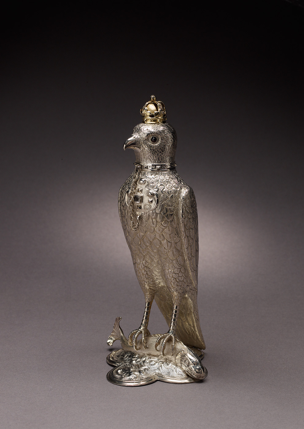 In de 17de eeuw waren exotische specerijen een kostbaar bezit. Evenals de bussen en dozen waarin ze werden bewaard, zoals deze bus in de vorm van een valk. Op de kop van de vogel staat een vergulde keizerskroon en zijn ogen zijn ingelegd met granaten. ( Laura van Hasselt)
