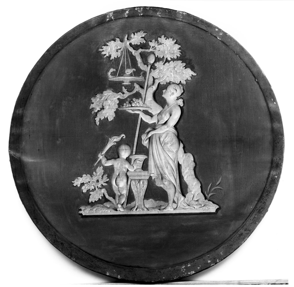 Witte geschaduwde schildering op lichtbruin fond. Dit ronde schilderij hoort waarschijnlijk boven de deur in de lange wand tegenover de schoorsteen.- HerkomstAfkomstig uit Herengracht 488; schenking 't Woonhuys, Amsterdam, 1972